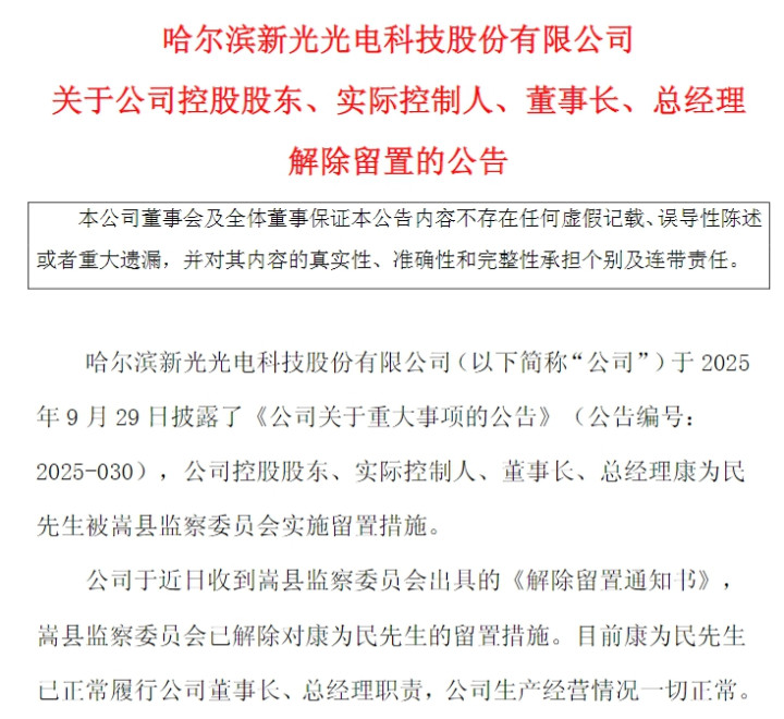 10月22日,新光光电发布公告表示,公司于近日收到嵩县监察委员会出具的《解除留置通知书》,嵩县监察委员会已解除对康为民的留置措施。目前康为民先生已正常履行公司董事长、总经理职责,公司生产经营情况一切正常。